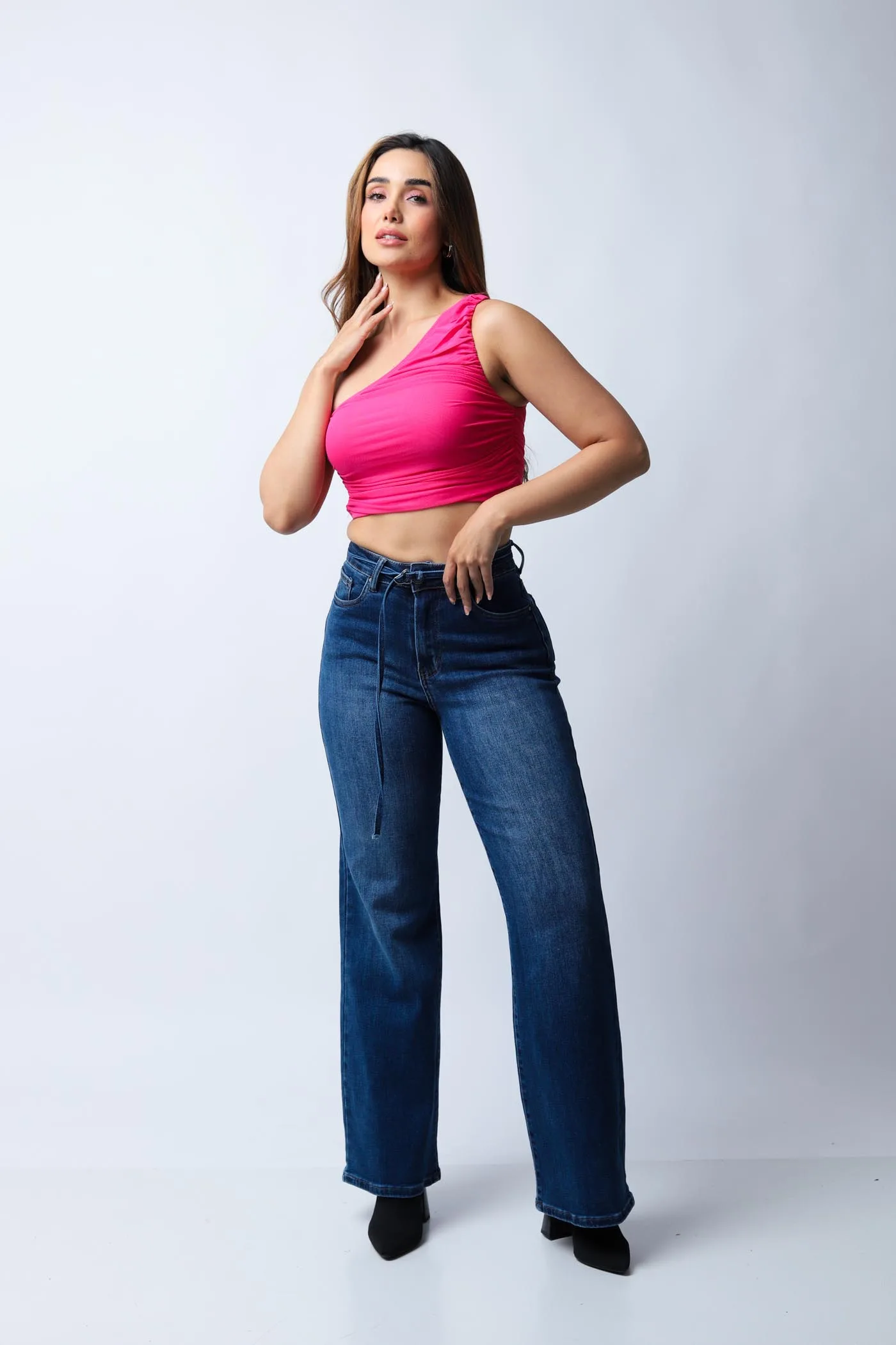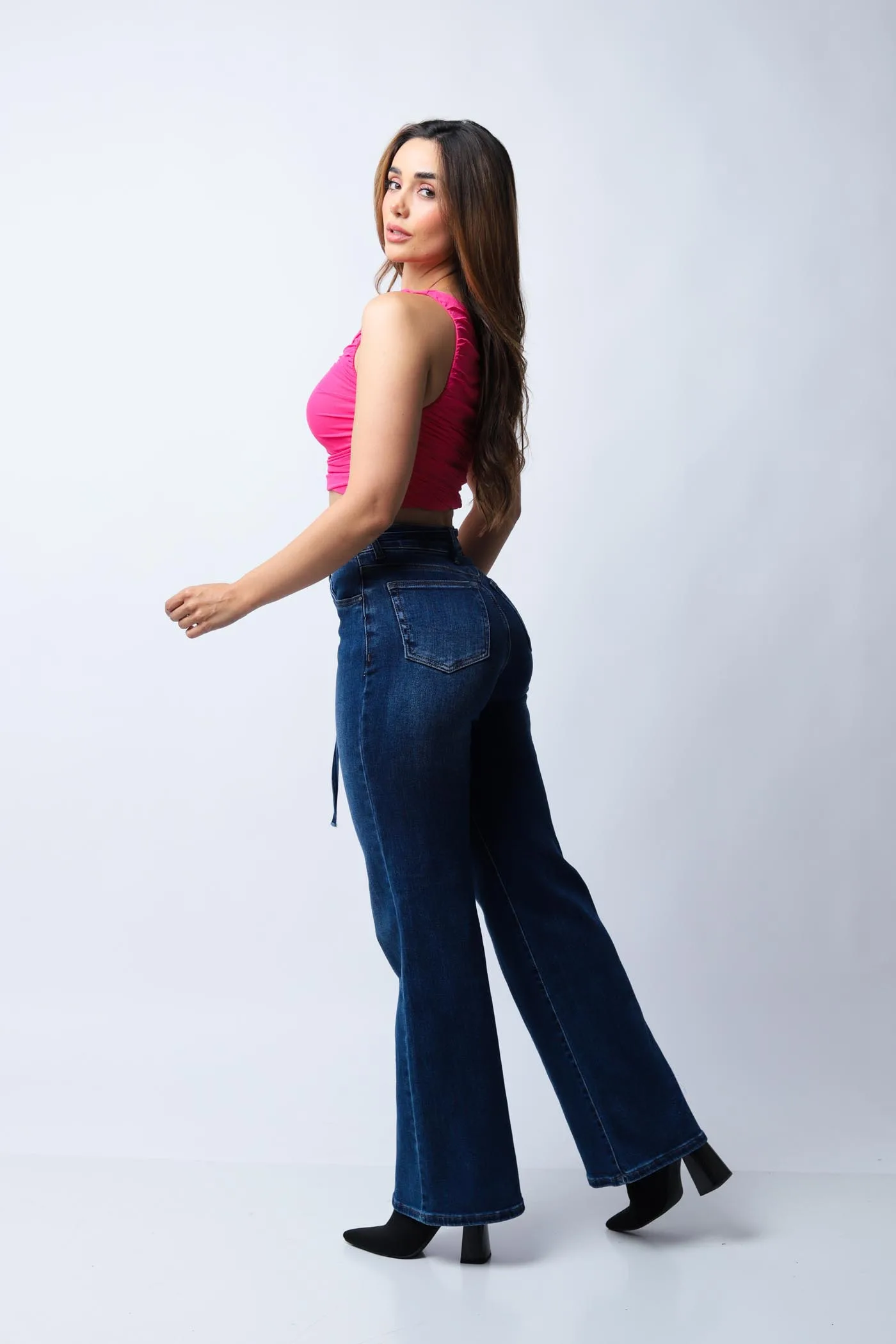 Tiro alto y silueta recta con ligero ensanche en el bajo, que estiliza la figura y aporta un aire elegante de inspiración náutica.
